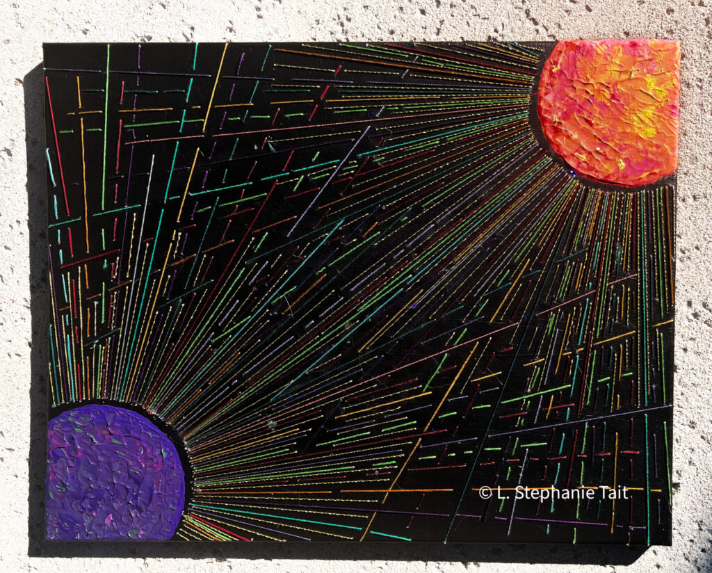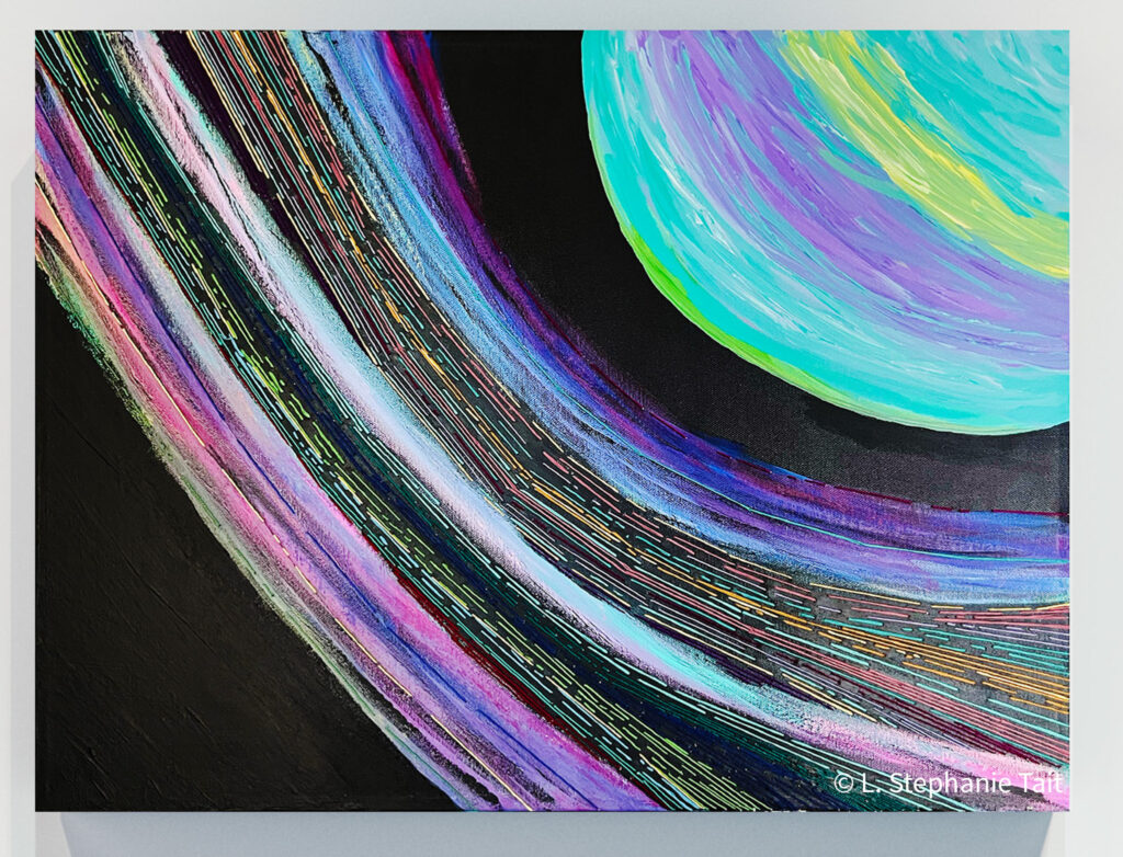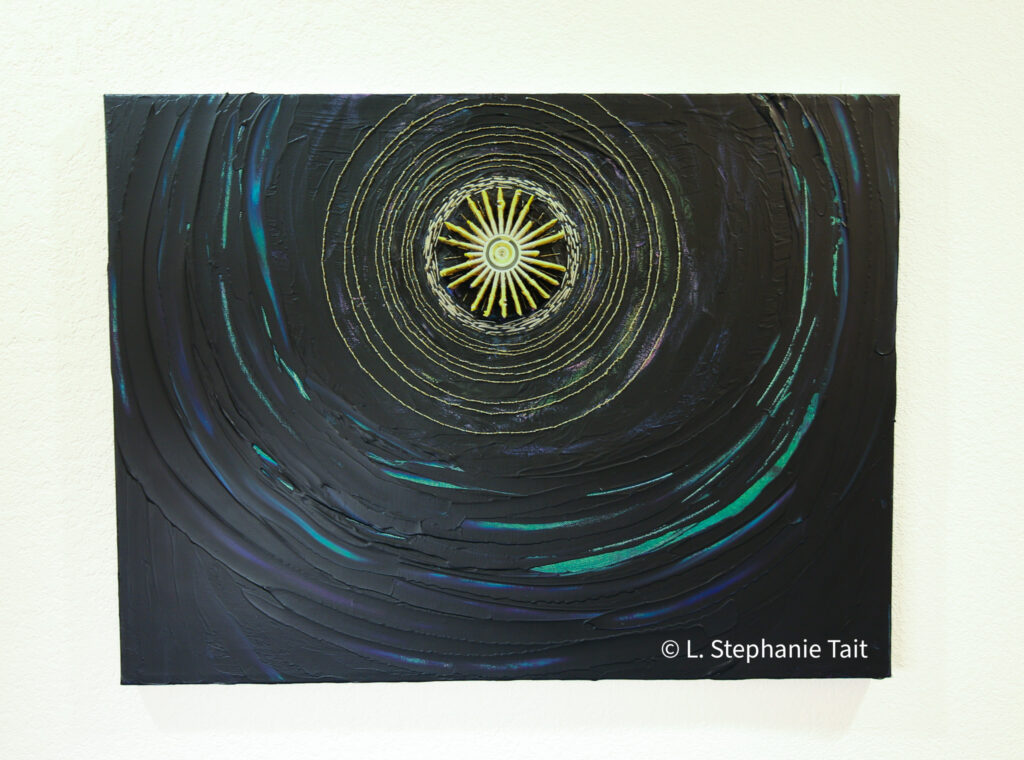 In the last couple of years Stephanie’s style has blended her embroidery skills with her lack of discipline and training in acrylic painting. It has given her (and her arthritis) an incredible amount of joy.